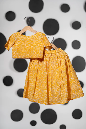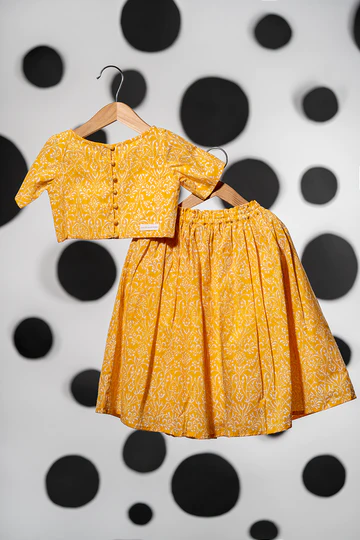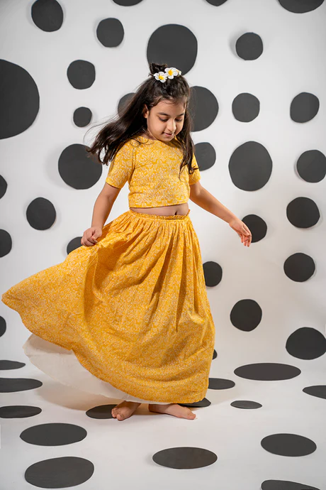 Set of 2 – ‘From our memory box’ yellow lehenga in cotton floral hand block print