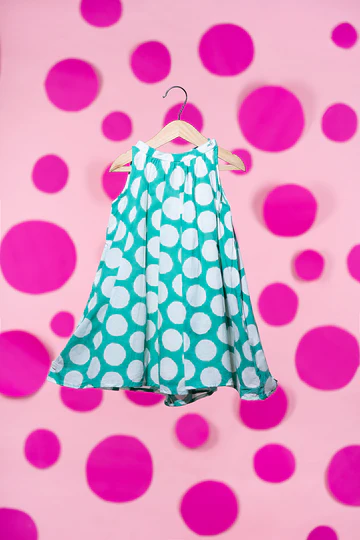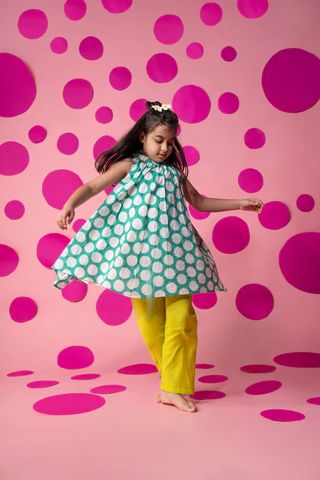 Polkas, polkas, a universe of magical hand block-printed polkas. This halter neck dress is dressy and versatile all at the same time. Detailed with pockets, adjustable neck and a bright pyjama to go with, this outfit screams festive fun and is perfect to celebrate any occasion in comfort surrounded by your kin.