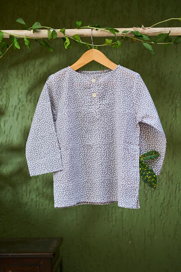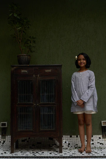 ‘Sleepover party’ kids unisex kurta in grey hand block print cotton malmal