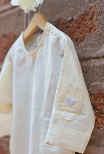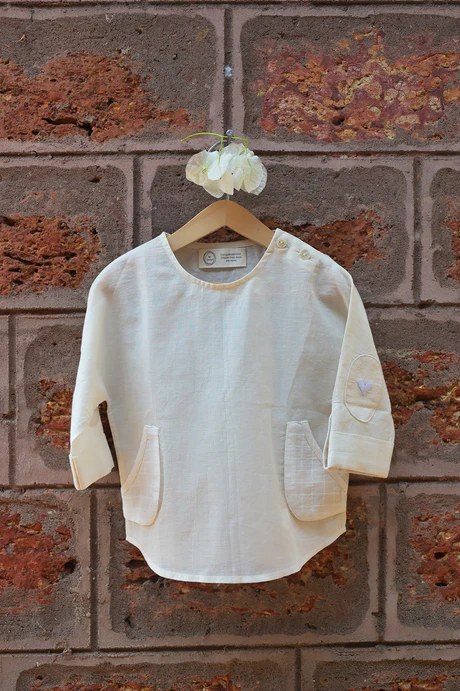 A kimono sleeve style unisex shirt to give your little one freedom of movement. Playful and breezy, detailed with an accordion pocket to hide heaps and piles of treasures and an embroidered elbow patch with a magical heart.