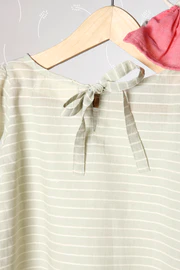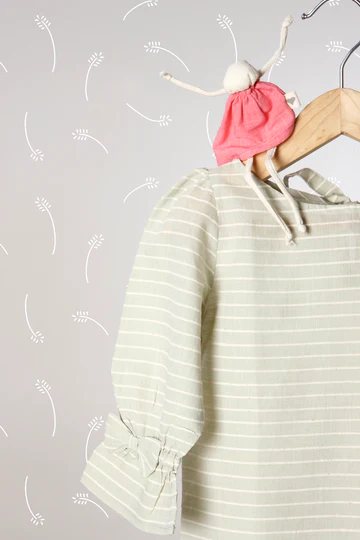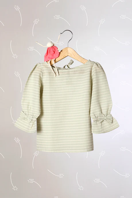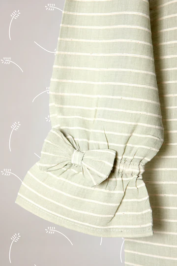 One of the charms of country life is the endless green fields. What a joy to be surrounded by and breathing green! This top is an ode to the countryside. And if you look closely, you’ll find them little beautiful details in the striped hand weave of the fabric, the frill at the wrist, the bow at the wrist or the tie ups at the back!