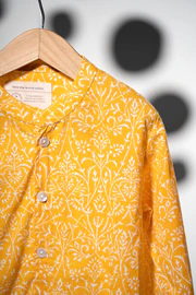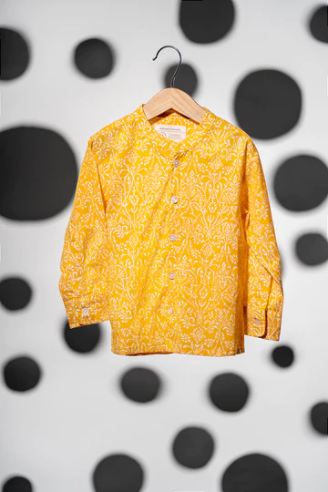 As far as my memory can stretch, I remember those beautiful marigold garlands adorning our house door every festival. I loved what that yellow colour did to my home and my heart. It’s such a joyous flower! And hope your little joy spreader feels the same way in this yellow shirt.