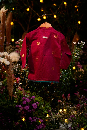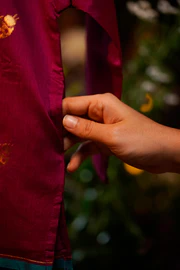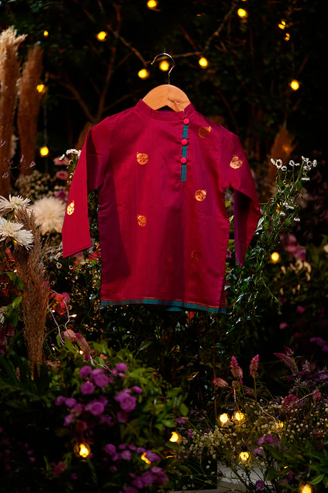 Sometimes love is truly in the details (and comfort!). Don’t miss the zari woven bugs (keeda), contrast teal selvedge and bright pink potli buttons! Oh! And did we mention it has pockets?