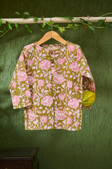 ‘Sleepover party’ kids unisex kurta in green floral hand block print cotton malmal