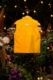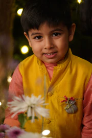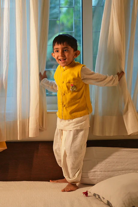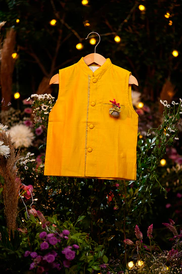 This jacket is pure love! Wear it over a kurta or a shirt, this unisex bandi is an absolute delight! Detailed with contrasting selvedge, potli buttons in self fabric and a handmade upcycled BROOCH, aptly named ‘Squeezy’, this jacket is super versatile that can be matched with so many kurtas and shirts.
