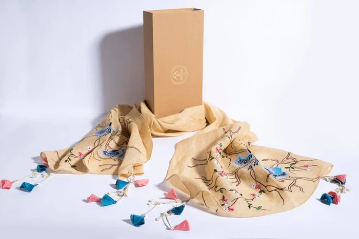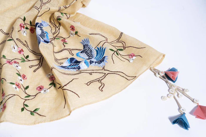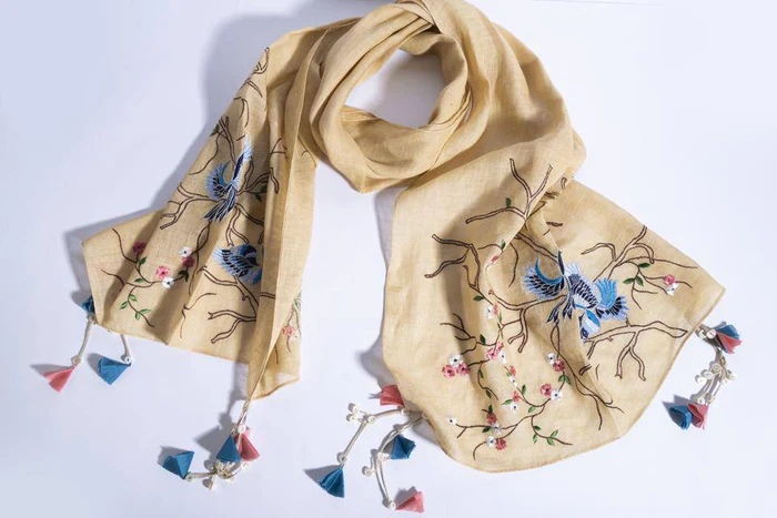 Cream Linen Scarf With Embroidered Birds And Fancy Corner Tassels