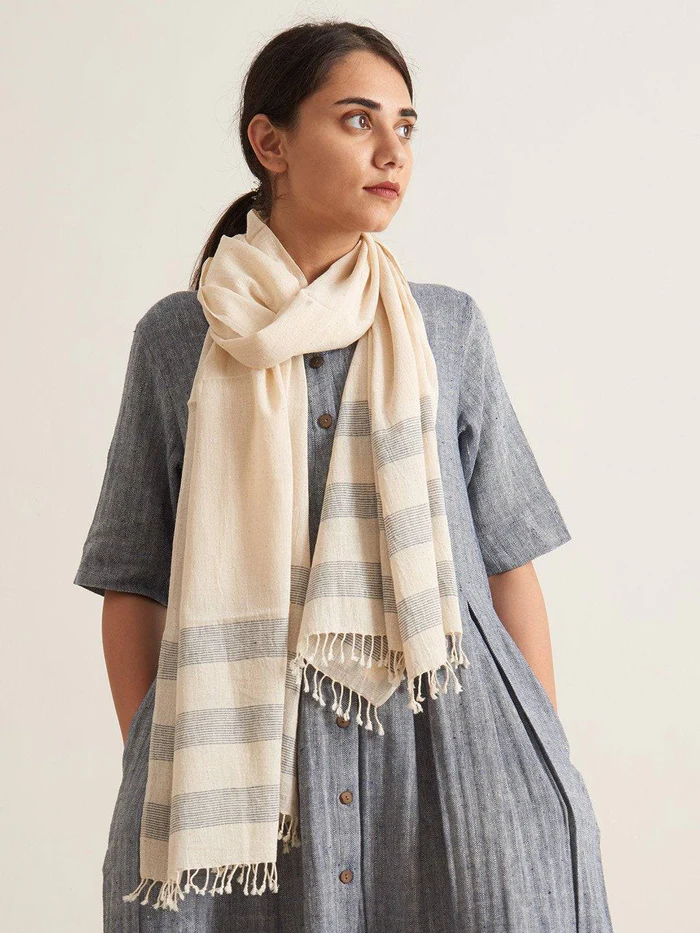 Minimal indigo striped scarf. It has a soft feel. This is handwoven fabric and the indigo threads are dyed with 100% natural dyes. It is 100% natural cotton also known as kala kapas. This is an eco-friendly and sustainable product. Kala kapas grows in drought prone areas of India making it further more sustainable cotton species.