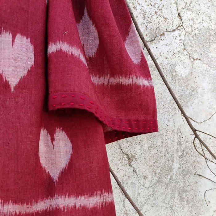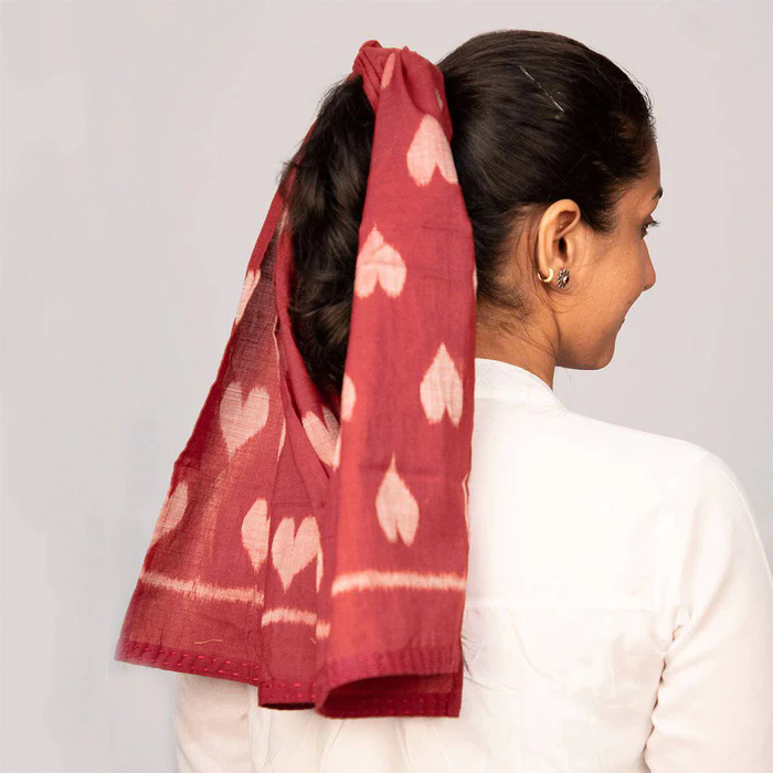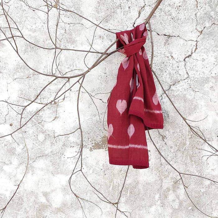 Maroon ikat scarf with allover taash heart motifs with maroon edging embellished with pretty little darning stitches. Wear it around your neck or use it as a hair scarf. This versatile scarf is the loveliest accessory you can have in your wardrobe.