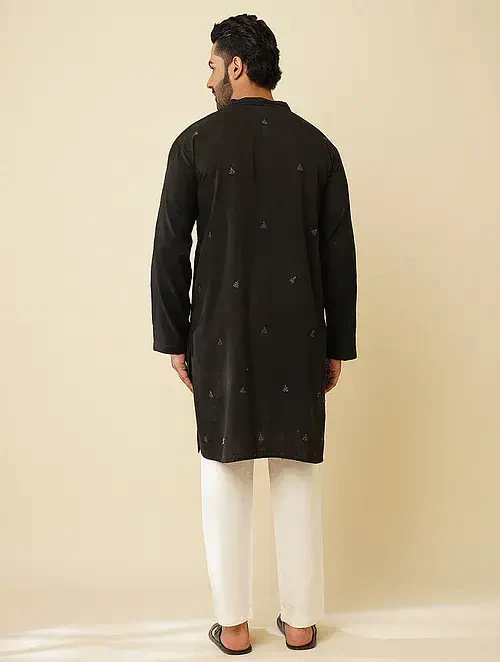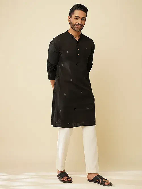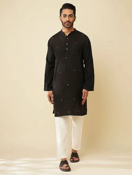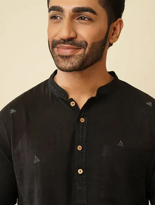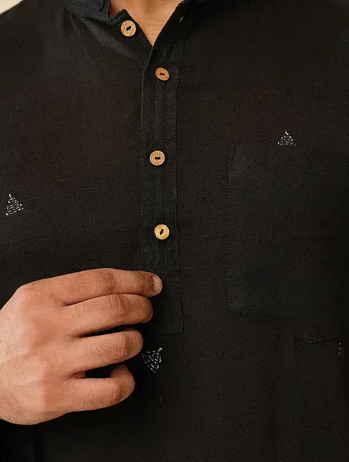 Presenting our Black Pure Khadi Cotton Kurta for men with Mandarin Collar made from Indian Handloom Cotton Fabric.This designer men Kurta has four wooden Buttons on a Placket and is adored with minimalistic Zari hand embroidery. Ideal for festival season.