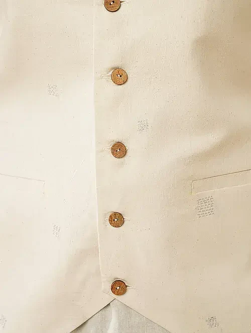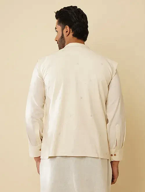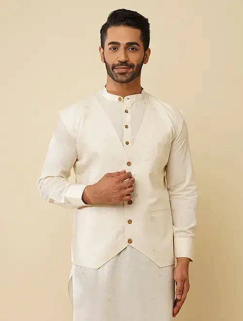 This classic Off White Khadi Cotton Jacket for Men is constructed on a luxurious base of Indian Handloom Khadi Fabric. Further highlighted by minimalistic embroidery. An ideal staple in your everyday wardrobe.