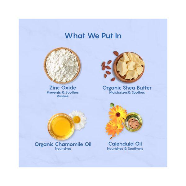 - Shea butter rich in anti-inflammatory property nourishes and protects baby’s delicate skin.